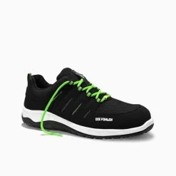 Das Obermaterial des schwarz-grünen Sicherheitsschuhs besteht aus wasserabweisender hydrophobierter Mikrofaser und Textilmaterial. Das atmungsaktive Textilfutter sorgt für angenehmen Tragekomfort. Die eingesetzte Stahlkappe sowie die metallfreie Durchtritthemmung bewahren die Füße vor Verletzungen. Der ESD-fähige und lederfreie Schuh mit einem „Die Fohlen“-Aufdruck ist im Größengang 35 bis 48 erhältlich.