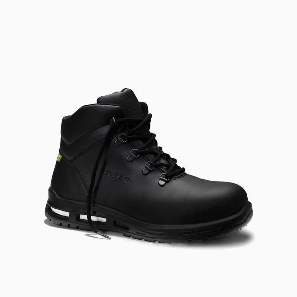 Sieht nicht nur kraftvoll aus, er ist es auch: der BRANDON XXTM black Mid ESD S3. Diese Mid-Top Variante des BRANDON XXTM bietet aufgrund des höheren Schafts noch mehr Standfestigkeit, was aber gleichgeblieben ist, ist seine überaus robuste Zähigkeit. Kein Wunder, denn das Obermaterial aus hydrophobierter Mikrofaser ist besonders reißfest und macht ihn beständig gegen Feuchtigkeit und Nässe. Dank der gepolsterten Lasche hat auch eindringender Schmutz keine Chance, die Polsterung der Lasche selbst verhindert Druckstellen am Fuß. Und was dem Fuß noch mehr Wohlgefühl verschafft, ist zum einen das atmungsaktive Textilfutter, dank dessen sich das Mikroklima im Schuh quasi von selbst reguliert. Zum anderen die Laufsohle aus einschichtigem PU, die WELLMAXX TRAINERS MONO Sohle mit dem Sohlenkern aus Infinergy® von BASF. Denn das federt beim Auftreten extrem gut zurück sorgt für eine ganzflächige Dämpfung. So wird auch stundenlanges Gehen oder Stehen nie zur Qual – was für ein Segen für Muskeln und Gelenke! Die Kunststoffkappe vorne und der metallfreie Durchtrittschutz sorgen für wirkungsvollen Rundum-Schutz vor Gefahreneinwirkungen. ESD-fähig und SRC-zertifiziert ist der eloquente Sicherheitsschnürstiefel auch, lieferbar in dem Größengang 36 bis 48.