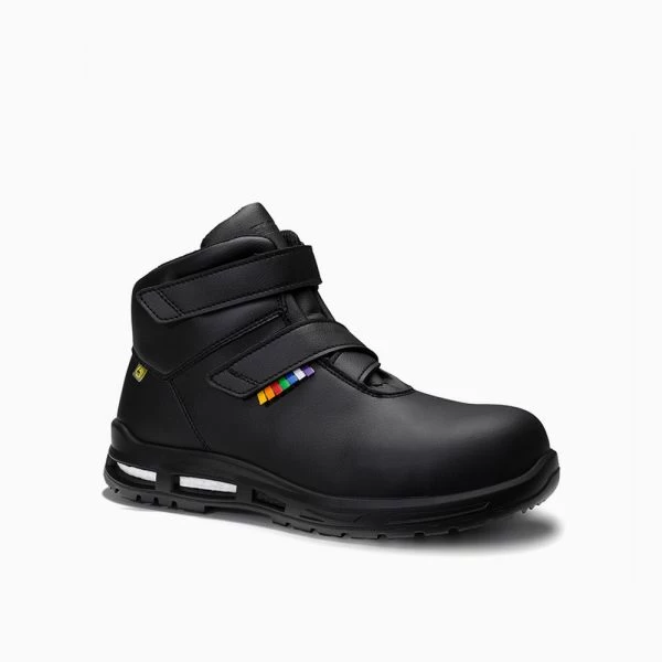 Der BRAYDEN XXTM black Strap Mid ESD S3 ist ein Sicherheitsstiefel, der von der Form her schon überzeugt, aber auch mit cleveren Funktionen glänzen kann. Als Mid-Top Variante sorgt der höhere Schafteinstieg für mehr Stabilität, zugleich aber auch für mehr Schutz der Knöchel oberhalb des Sprunggelenks. Das Obermaterial aus hydrophobierter Mikrofaser bietet generell viele Vorteile: besonders weich, formbeständig, reißfest, schnell trocknend – und durch die Hydrophobierung auch feuchtigkeitsabwehrend. Und auch das Innenfutter hält da gut mit, denn es ist atmungsaktiv und damit klimaregulierend. Die Kunststoffkappe schützt den Zehenbereich, der metallfreie Durchtrittschutz sichert gegen Gefahren von unten und die MONO PU Sohle WELLMAXX TRAINERS MONO sorgt mit dem Sohlenkern aus Infinergy® von BASF für erstklassige Dämpfung. Der Clou sind aber die farbigen Abreiß-Etiketten am Schaftrand: damit lässt sich der Schuh für verschiedene Einsatzbereiche markieren. So weiß man schon mit einem Blick auf den Schuh, wo sein Träger hingehört. Bestellen kann man den SRC-zertifizierten und ESD-fähigen BRAYDEN XXTM black Strap Mid ESD S3 in den Größen 36 bis 48.